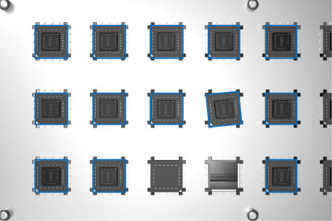 識別Tray盤上的每個晶片位置,檢測是否存在歪斜、正反安裝和缺失等問題。有助於提高生產效率,確保產品質量。